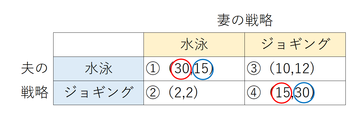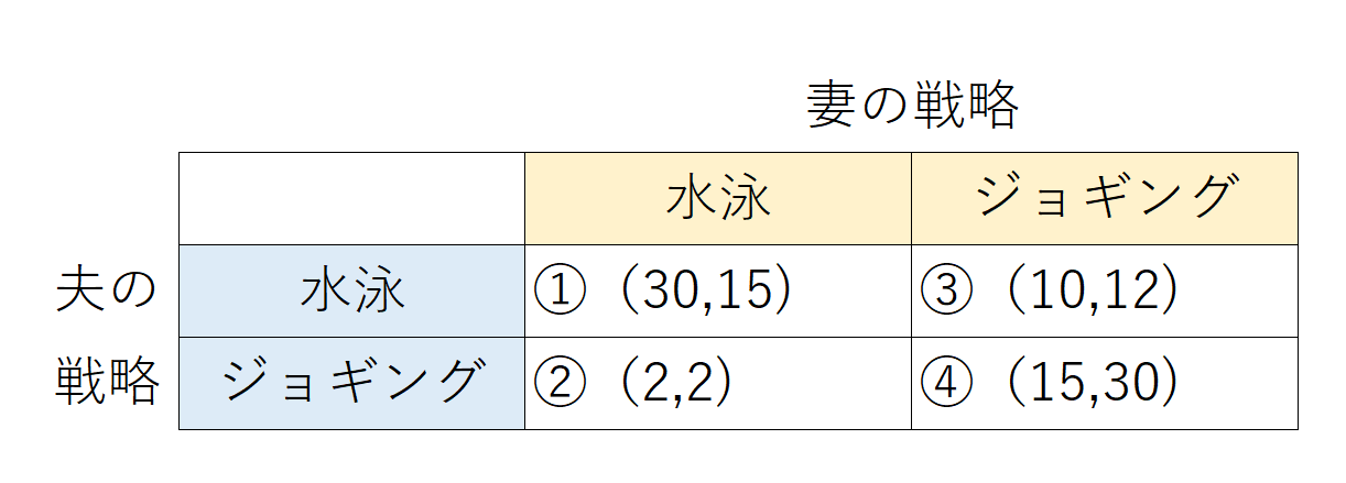 下表の利得マトリックスは、夫婦の戦略(水泳とジョギング)とそれにより得られる利得を示したものである。