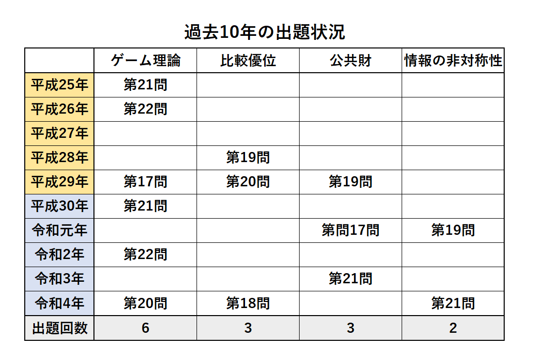 「情報の非対称性」は過去10年間で2回しか出題されていません。