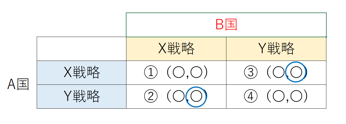 今度は青丸が縦一列に並びました。つまりB国にとってもY戦略が「支配戦略」ということになります。