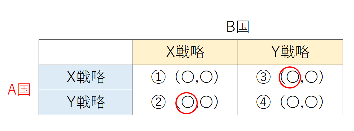 自国が有利になる戦略(①②で左側の数字が大きい方)に赤丸を入れます。