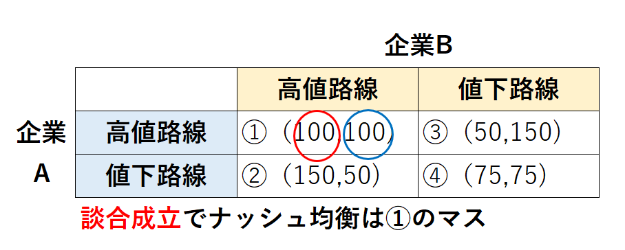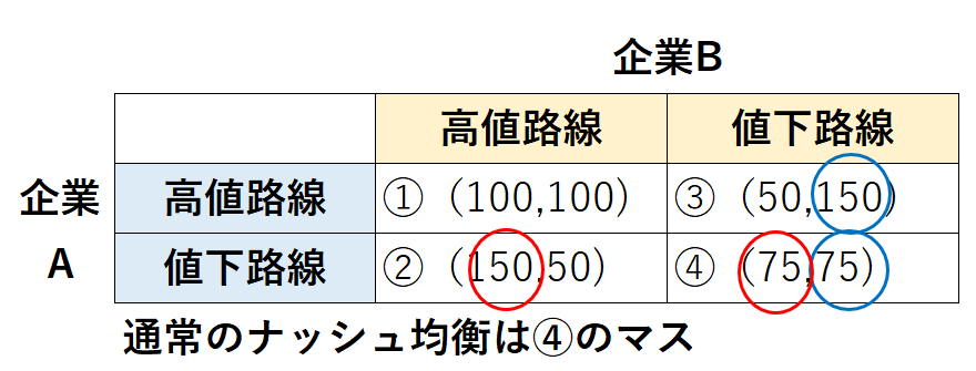 ナッシュ均衡の定義は「どのプレーヤーも自分の戦略を変更することによってより高い利得を得ることができない戦略の組み合わせ」(ウイキペディアより)とのことです。ただ、そんな面倒くさい定義を覚えるのも、また試験本番中に思い出すのも大変ですので、診断士受験のレベルであれば「赤丸・青丸が同じマスに仲良く並んだらナッシュ均衡」という浅はかな(?)理解で乗り切ってしまった方が現実的です。