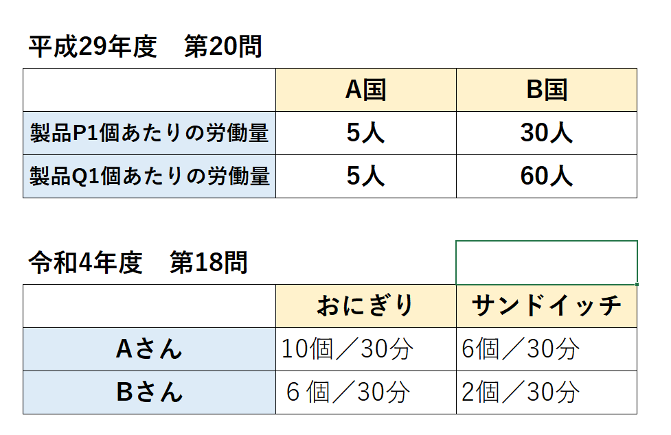 私の場合は令和4年度 第18問の形(生産者がタテに、生産物がヨコに並ぶ)が分かりやすかったので、平成29年 第20問のような出題の場合は手書きで表を書き直してから考えていました。