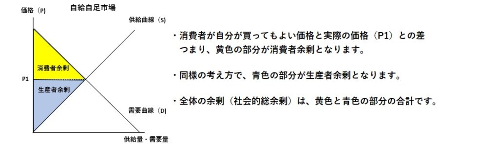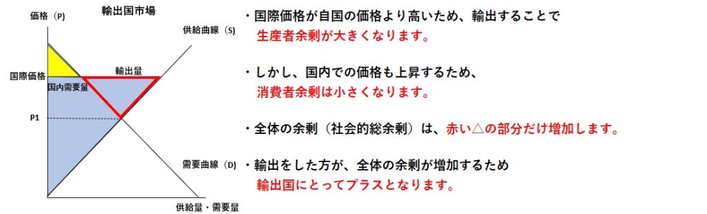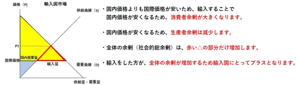 輸出国、輸入国の双方の国にとって国全体の余剰がプラスになります。