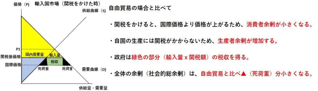 関税をかけた場合は、輸入国の生産者余剰は増加しますが、消費者余剰が小さくなり、