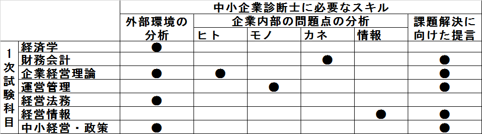 ちなみに、下記は私が当時考えた中小企業診断に必要なスキルと試験科目との対応表となります。