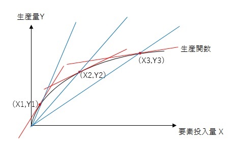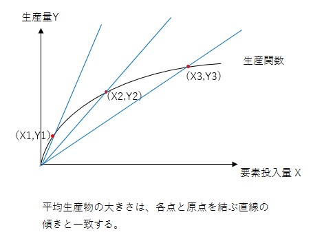 生産関数上の任意の点(X1, Y1)(X2, Y2)(X3, Y3)における平均生産物をそれぞれA1, A2, A3とした場合、Y1/X1=A1 Y2/X2=A2 Y3/X3=A3とあらわすことができます。