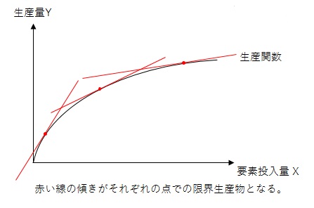 ある要素投入量に対応する生産関数の接線の傾きを「限界生産物」と呼ぶことにする。