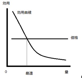限界効用がビール一杯分の価格を上回る=価格に対して満足感が上回る限り、ビールを飲み続けますが、限界効用が価格を下回ると、「損をする」状態になります。よって、限界効用=価格、となる部分でビールを飲むのをやめます。この点が私たち(消費者)にとって最適点となります