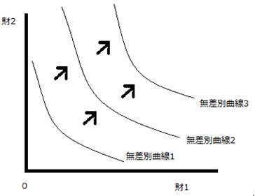加えて「持っている財が多ければ多いほど、満足度が高い」ため、下図で言うと無差別曲線1より2、2より3の方が効用が高いことを示しています。