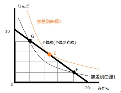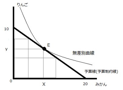 この時、無差別曲線と予算線が接するE点が「最適消費量」すなわち「予算の範囲で最も満足できる量」となります。