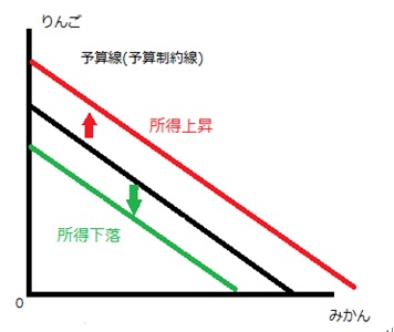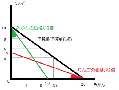 みかんの価格が上昇する→予算の範囲で買えるみかんの量が減る→予算線の傾きが(この場合は)急になります。