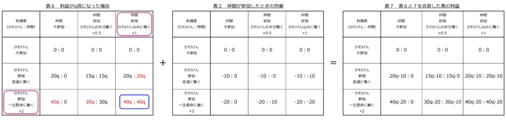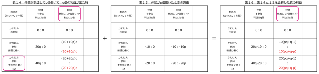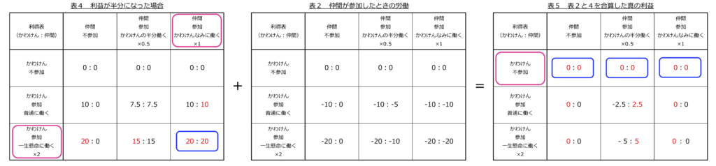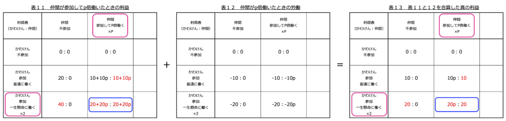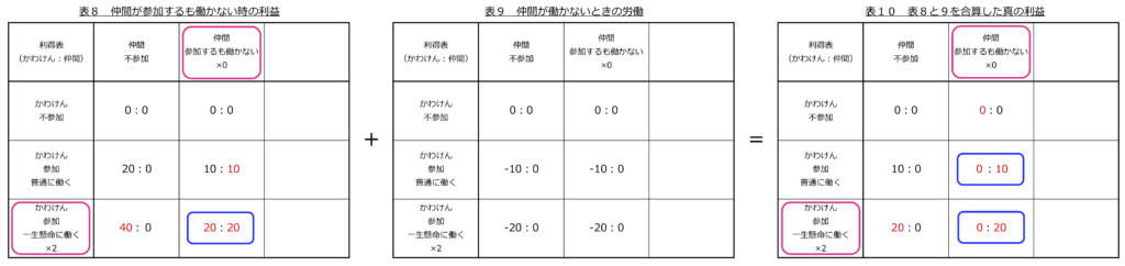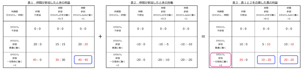 4ゲーム理論の実際への適応・起業編で行った利得表の合算は、正式な手段かは全然知りません。かわけんのオリジナルです。基本的には利得表の中は相対値なので、合算はダメかも知れませんが、現実世界に合わせて理解しやすいように足してみました。