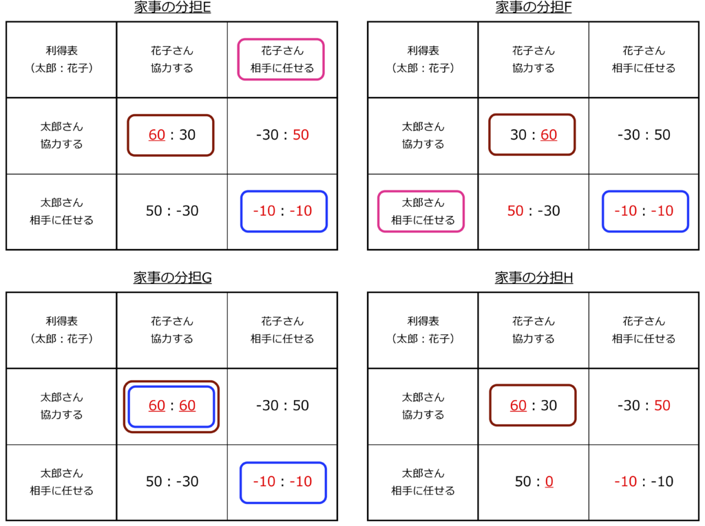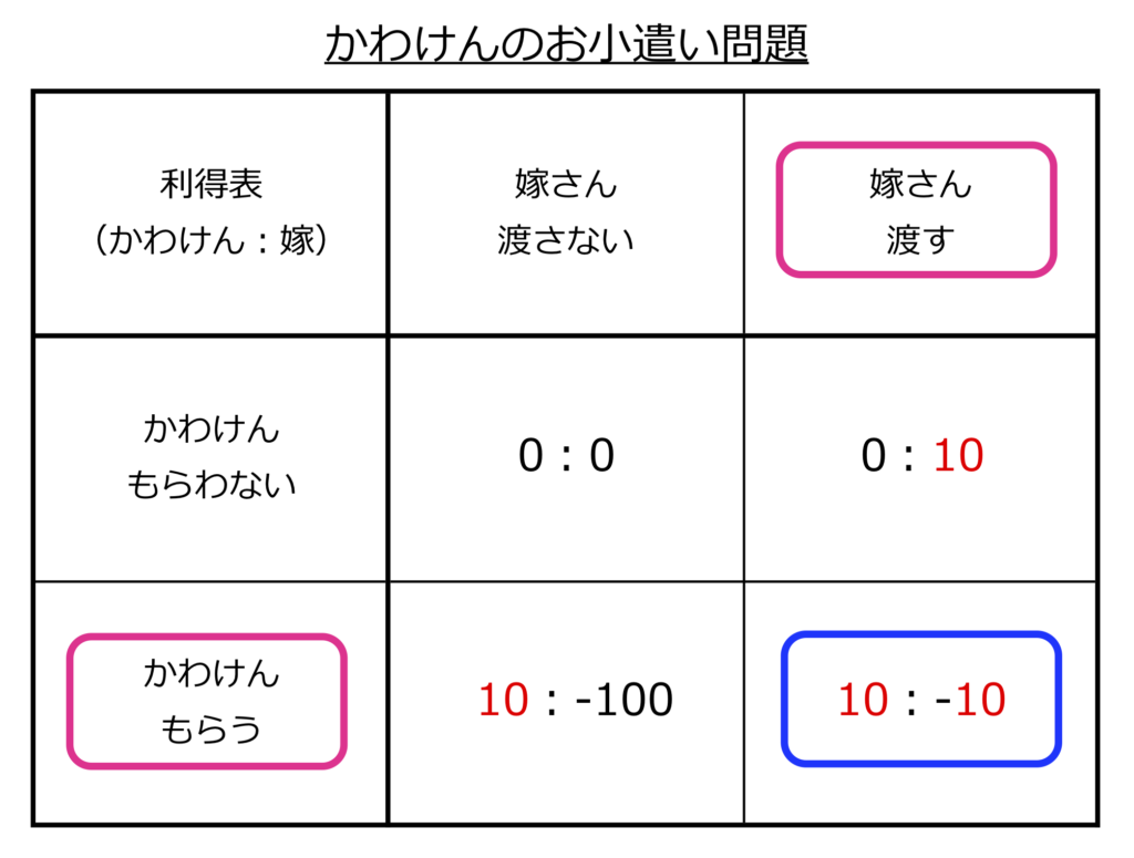 おお素晴らしい。かわけん「もらう」、嫁さん「渡す」がナッシュ均衡かつ支配戦略均衡になりました。理論上はお小遣いが絶対もらえるということです。とても望ましい結果ですね。