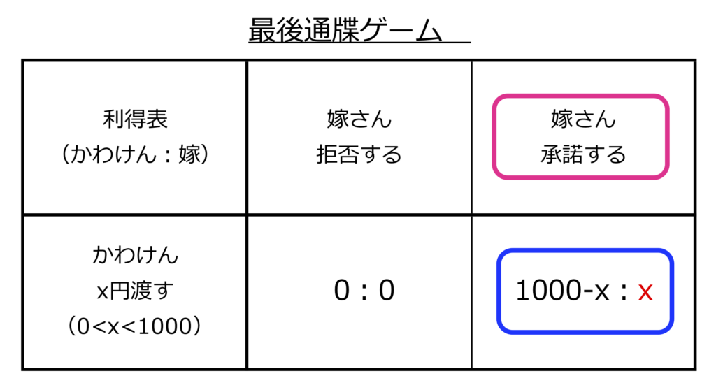 嫁さんが合理的な人間なら、拒否することなくx円を承諾します。xはかわけんが決めますから、かわけんが合理的なら1円(もしくは0円)にするはずです。したがってかわけん999円、嫁さんは1円が模範解答になります。