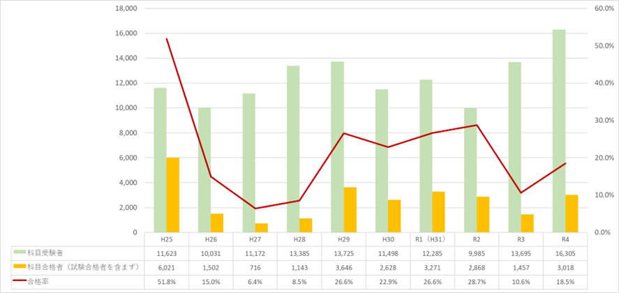グラフを見ると令和3年度の「五択化」で、令和2年度から科目合格率がガクッと下がったのがわかります。