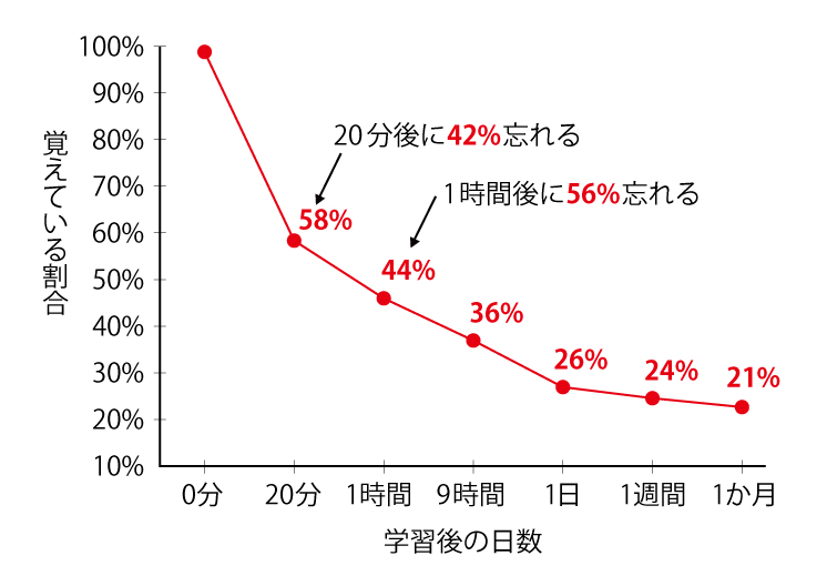 人が何かを学んだときに、20分後には42%忘れ、1時間後には56%忘れ、1日後には74%忘れ、1か月後には…(以下略)