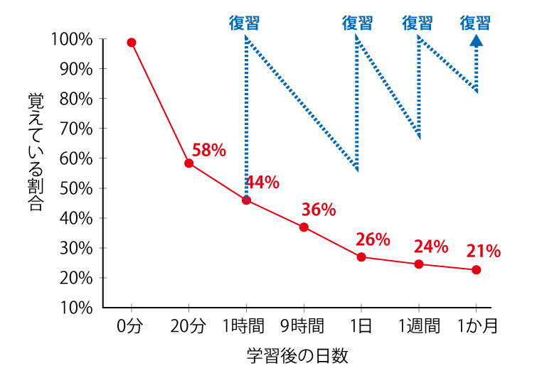 その関連の研究で、学習した後、24時間以内に10分間の復習をすると、いったん記憶が100%に戻り、次回は1週間以内に5分の復習をすると記憶が戻り、その次は1か月以内に2〜4分復習すると、また記憶が復活する、といわれています。