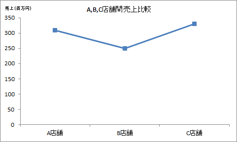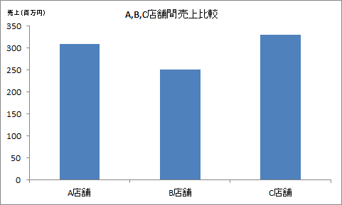 A店舗に比べ、Bは売上が低く、Cは売上が高いことが分かります。