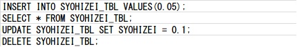 他の言語と異なり、データベースに特化した言語ですので、本例も消費税計算ではなく、テーブルへのレコード追加、参照、更新、削除の例を記載しています。