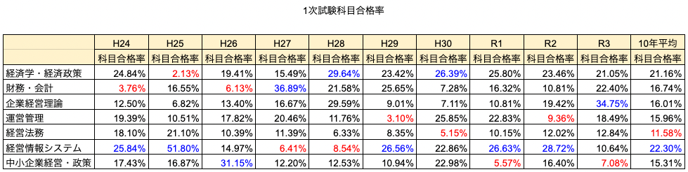 しかしながら過去10年の科目合格率を見ると下記の通り、ここ10年では科目合格率が一番高い科目です。科目合格者には「1次試験合格者」は含まれていないため実際には60点以上の受験者の割合はこれよりもかなり高くなります。
