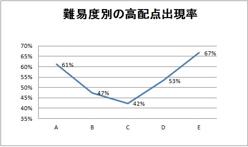 <難易度別高配点出現率: 難易度AとEが共に高い>