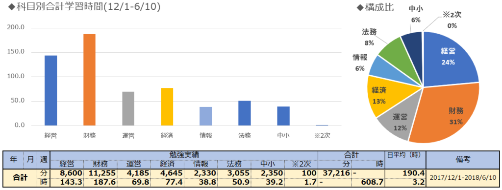 下記、私が中小企業診断士の勉強を始めた2017年12月1日から、ちょうど今頃、2018年6月10日までの約6ヵ月間で学習に費やした時間です。