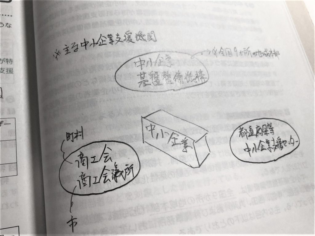 例えば、以下の写真はテキストの空きスペースにまとめた「主な中小企業支援機関」の図です。