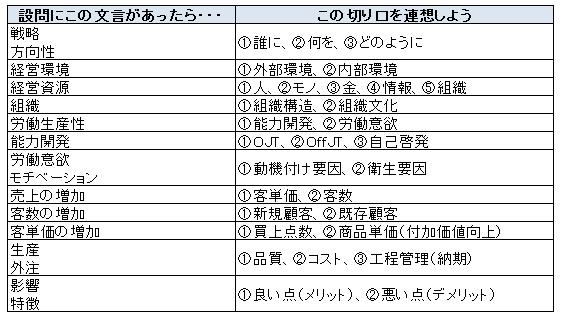 上述の例の場合、設問に「制度の設計」と「導入」と明記されているので気づきやすいと思います。ヒントが明記されていなくても、設問文の言葉から切り口を見つけることができるかと思います。
