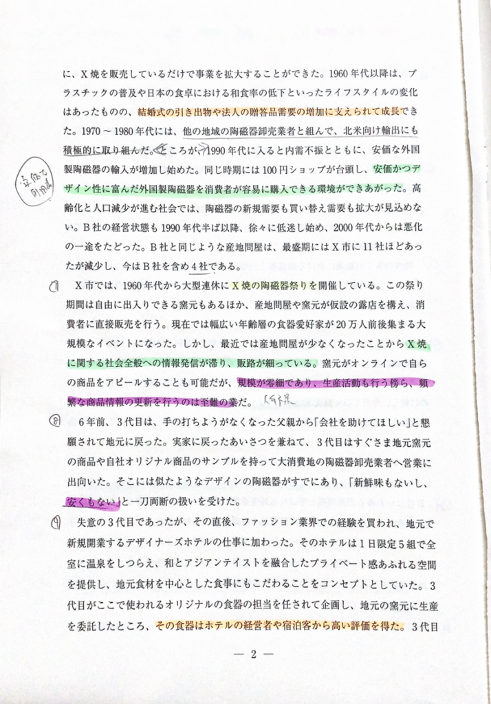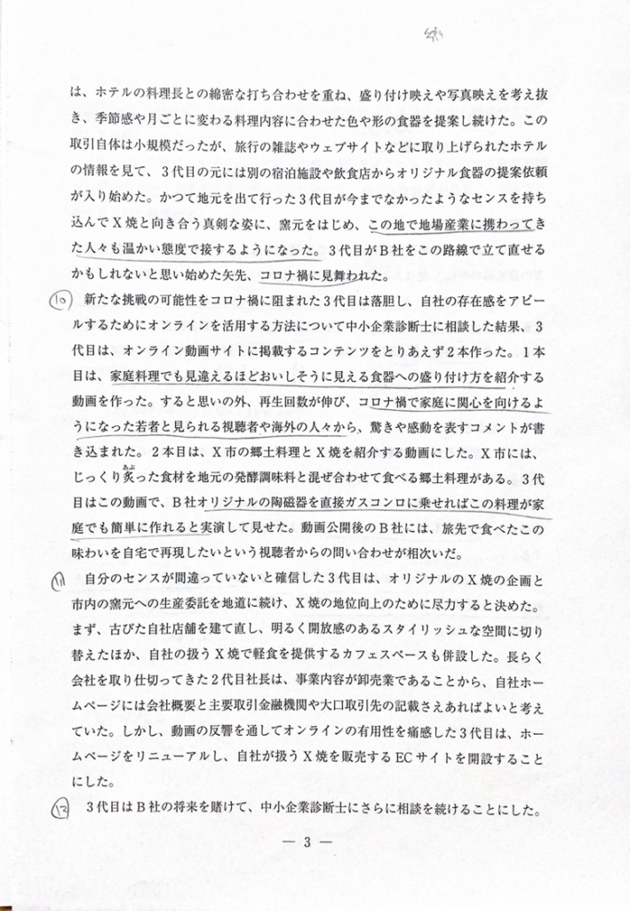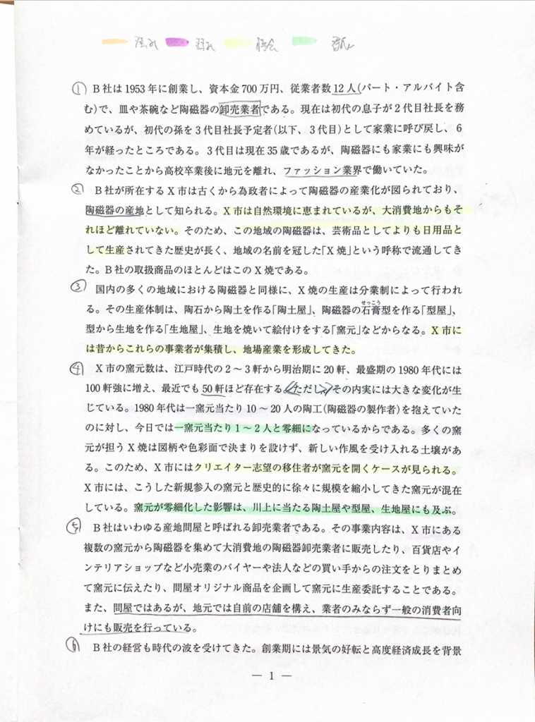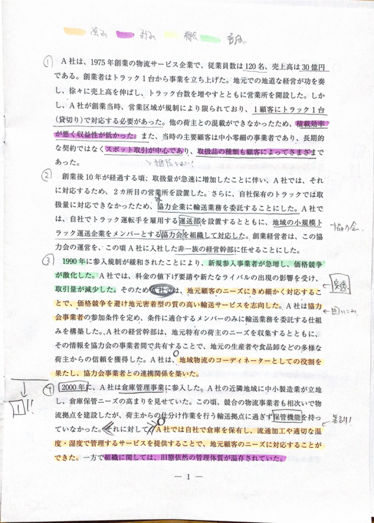 以下では、実際に私が2次試験で使った与件文のマーキング例(令和6年事例Ⅱ)の写真も掲載します。