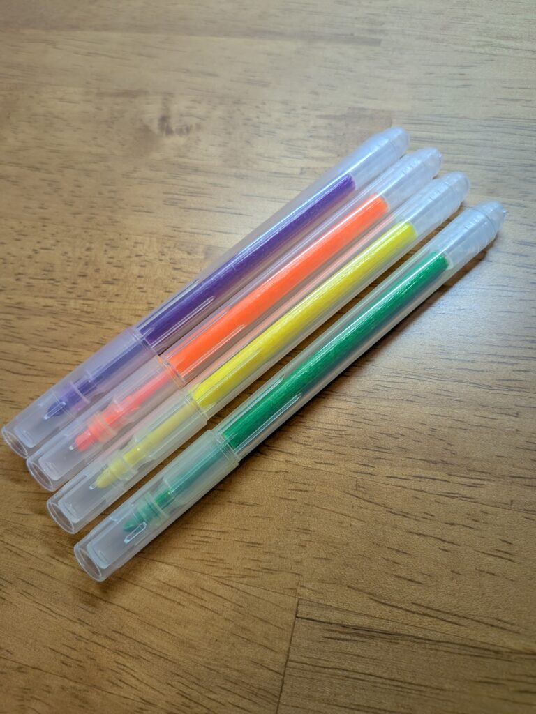 まずは、4色マーカーを買いに100円ショップに行くと、5色入り蛍光ペンを発見しました。
