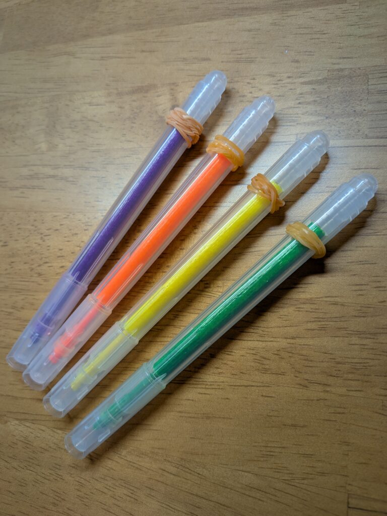- 紫で弱みを塗って、キャップを閉めて、次はオレンジを取り出して強み塗って…
