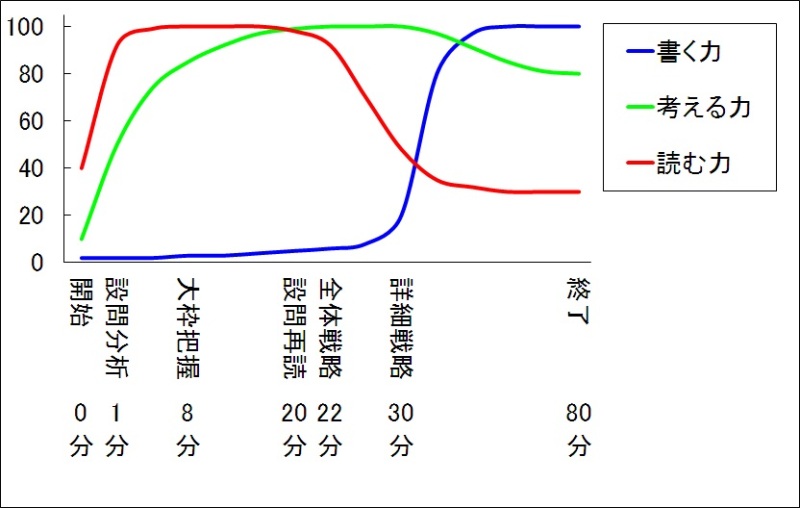 事例を解いている最中はどの力もフル回転しているように思われますが、実はこのように読む力→考える力→書く力に次々にシフトしていっているように感じます。