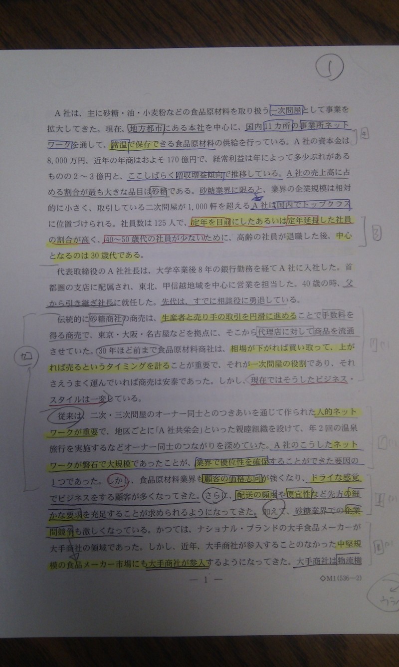設問をチェックした後に与件を読みますが、その時に「4色ボールペン+シャーペン」で以下のように線を引いていました。