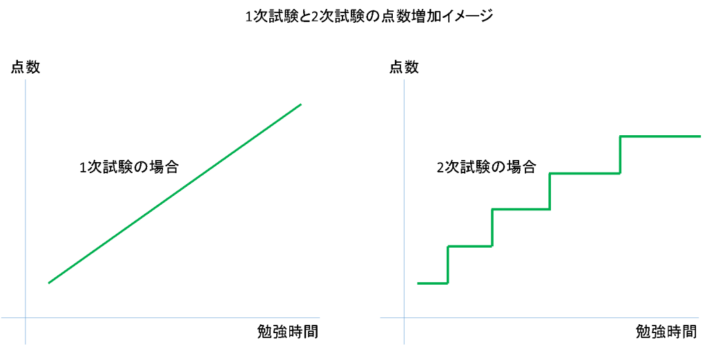 多分2次試験って、勉強をすればするほど点数が伸びるのではなく、階段を上るようにある時急に点数が伸びるような性質があると思うんです。