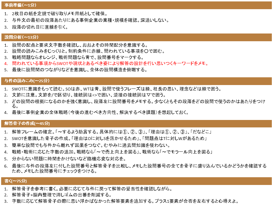 事例を解く際はこのタイムスケジュールを常に意識し、ちょっとペースが遅いので書く時間を短くしようとか、与件文がいつもより長いので考える時間が長くならないように注意しようとか、状況に応じて臨機応変な対応が出来るようになればもう完璧。80分の安定度はかなり増すと思います。