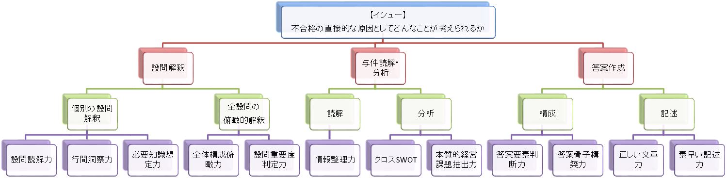 で、その上で第1段階「広げる」について考えてみました。切り口を決めて試験に係るスキルを分解し、不合格の原因となり得る要素を洗い出そうという試みです。その一例として前回は(ぼくの場合の)「解答プロセスに沿った枠組み」で考えてみました。