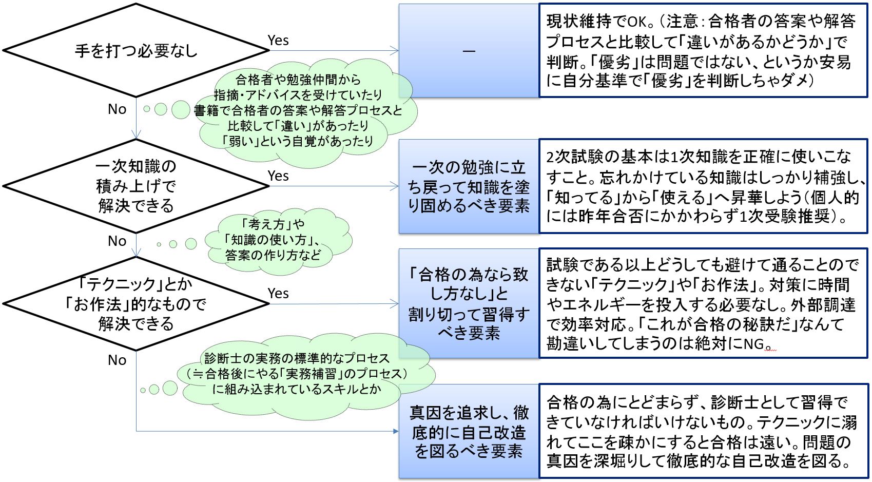 2つ目の分岐点は簡単です。「知識の有無」の問題か、「考え方」の問題か。知識系の要素で「要改善」と思われるものがあったら、1次の勉強に立ち返ってしっかり知識を固めるようにしましょう。