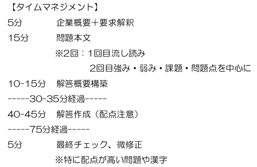 目安にあげたタイムスケジュールはおおよそ平均的なものかと思いますが、私は読むのが人一倍遅い上、与件文の読み込みに力を入れていたので、実際は解答の書き始めが試験開始から45分〜50分ということが多かったです。