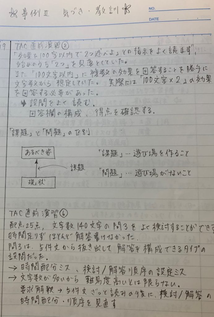 TACでは、毎週答練があり、事例Ⅰ~Ⅳのオリジナル新作問題を解くのですが、その際の気づきや教訓をノートにまとめましょう、ということでした。