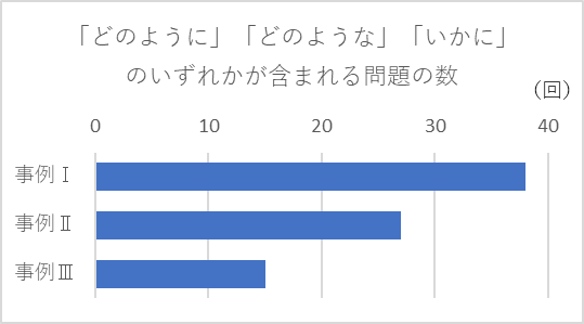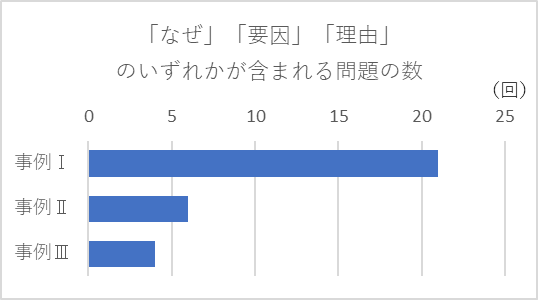 そうすると下図のように、事例Ⅰは「なぜ」「理由」「要因」というキーワードや、「どのように」「どのような」「いかに」といった問われ方が、事例Ⅱ・Ⅲと比べて高頻度で登場します。