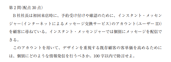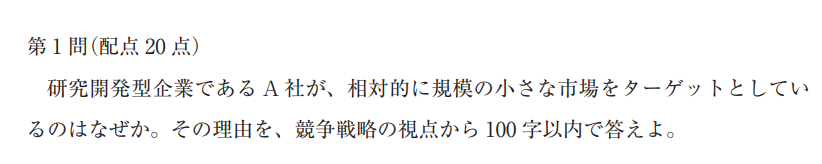 つまり、競争戦略に触れられなければ得点にならない、具体的には、この設問においては、1次試験科目の企業経営理論で学んだポーターの基本戦略に関する知識を踏まえ、回答する必要がある、ということです。(中小企業であれば、だいたい差別化集中戦略がセオリーですが(;^ω^))