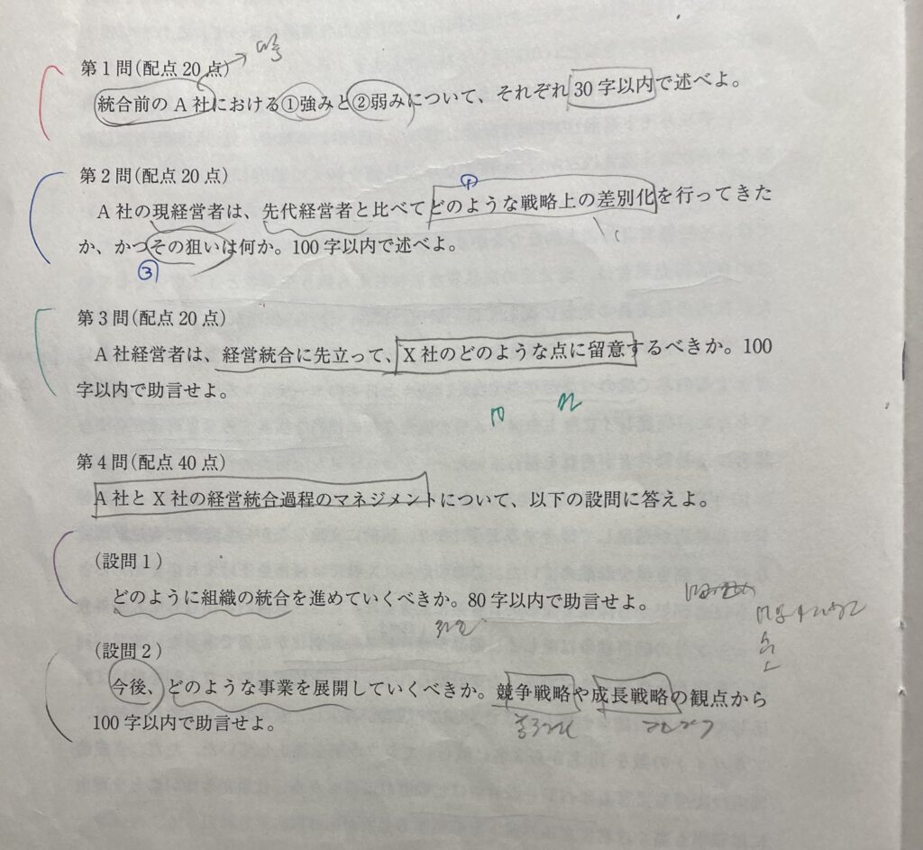 ただ(1)着眼点と設問別に色ペンを分ける、(2)80分のおおよその時間配分を決める、は点数UPに有効でしたので、下記にてご紹介したいと思います。