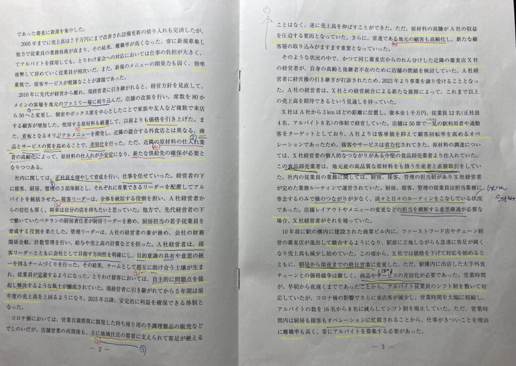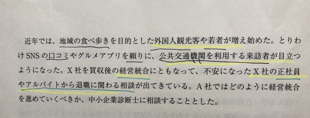 実はR5事例Ⅰでは試験中に、色ペンの線部分だけだと、解答の字数が足りない…!と漏れまくっていたのですが、その中でも蛍光ペンの着眼点から残りの要素を探せば良かったので、予防線(うまいっ!)になった認識です。