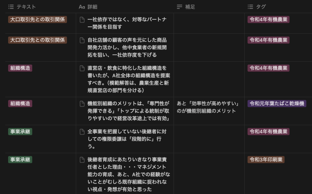 「大口取引先との取引関係」「組織構造」「事業承継」などテーマに分けて、自身の解答から改善すべきポイントを記述しました。
