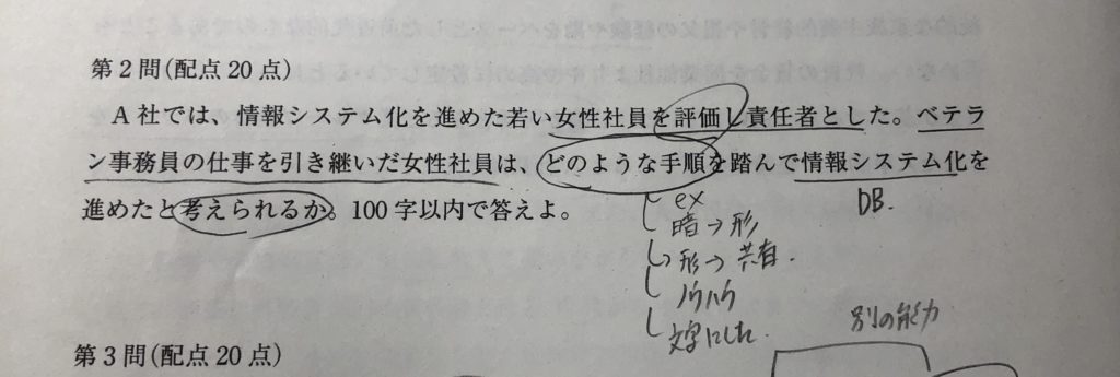 試験では与件文と問題から、回答の方向がだいたい決まるので、これで良いと思いました。