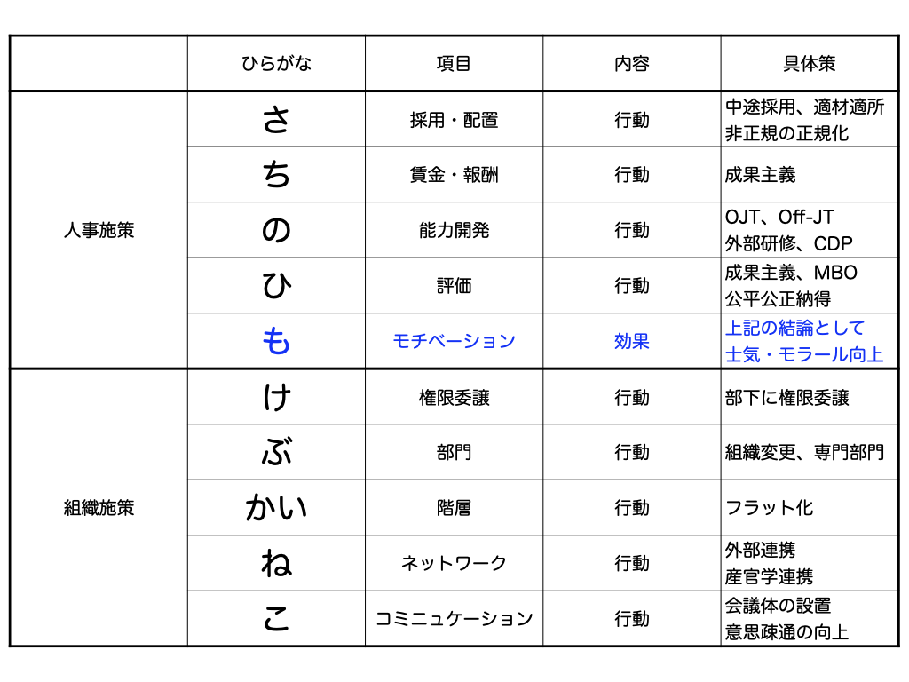 例えば、”さ”の採用ならまとめシートから切り出した図1を参照すると、士気向上・教育効果・離職防止などが記載されています(赤丸5)し、組織施策の”け”の権限委譲では、士気向上・迅速な意思決定・人材育成など挙げられます。このように効果はモチベーション(士気向上)だけではなく、各々の項目合わせた適切な効果を記載する必要があります。具体例に合わせた効果を整理しておきましょう。