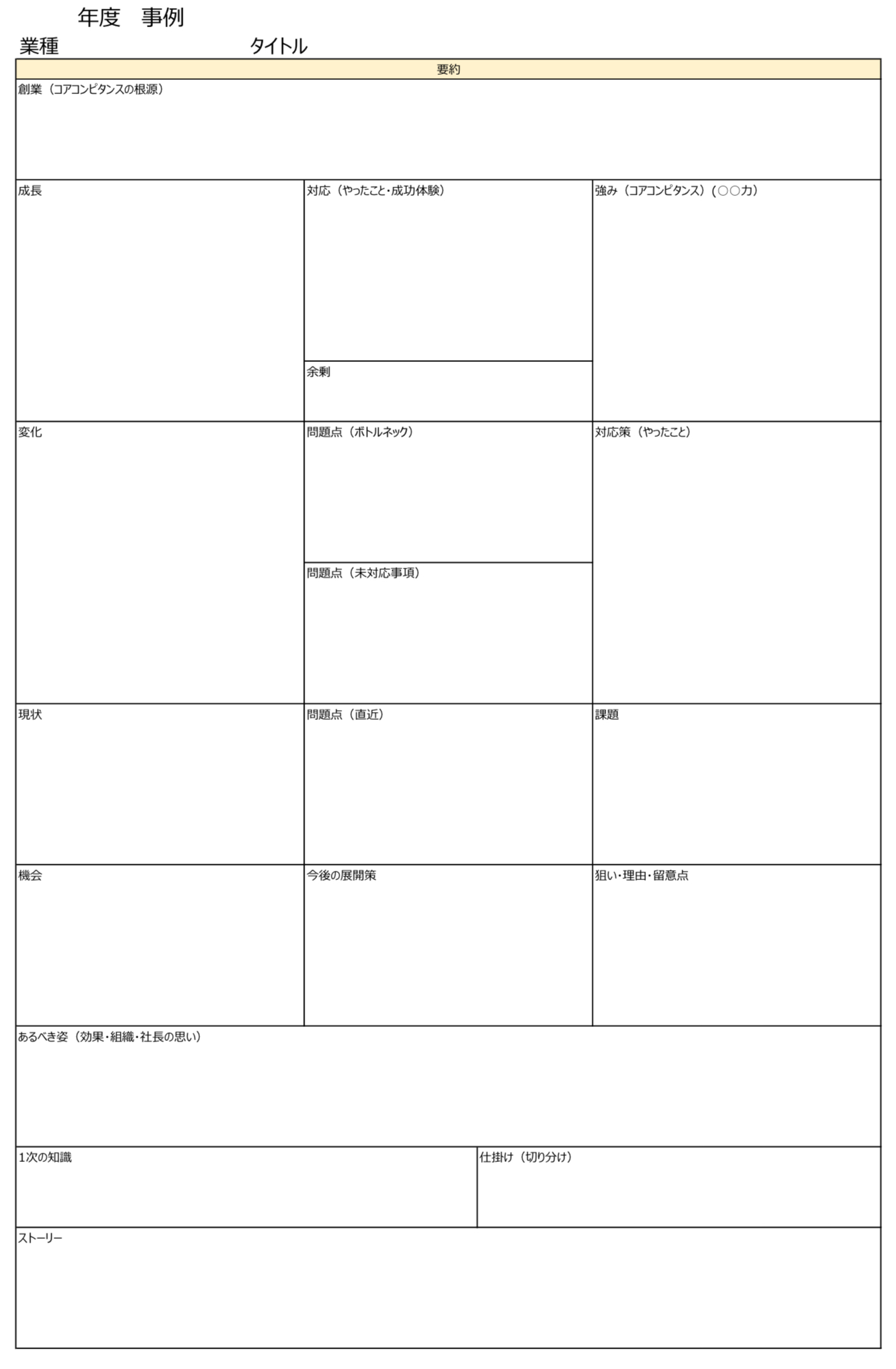 メリットは、①与件文の内容理解度が短時間で深まる、②設問切り分け失敗事故を減らせる、等です。そして、このフレームは、本番では書き出しませんでした。しっかりと体に染み込ませるまで、「時系列SWOT」に与件文と設問を対応させる練習を繰り返しやって来たからです。以下の図は、「時系列SWOT 」になる前に与件文を分析していた時のフレームです。