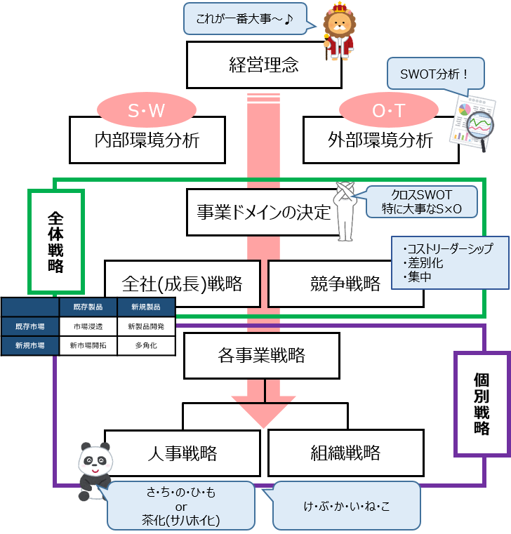 個別戦略:事例Ⅰであれば人事(人的資源)戦略&組織戦略、事例ⅡやⅢなら4Pなどがここに当てはまります。