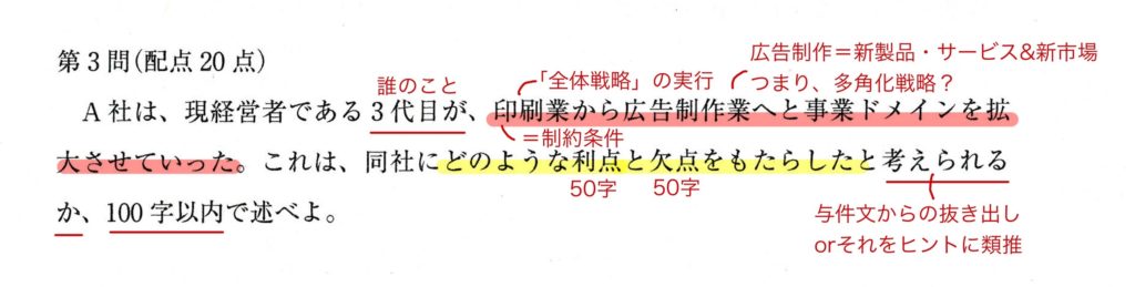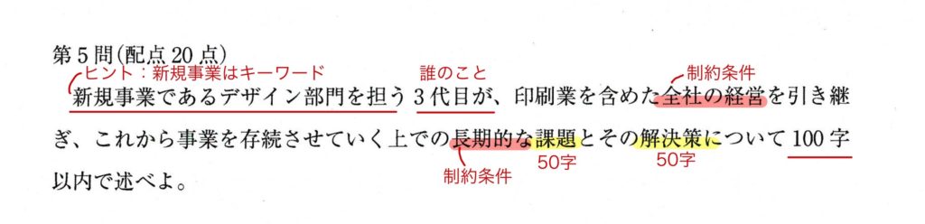 (黄蛍光=問われていること、赤蛍光=制約条件、赤下線=その他のポイント)
