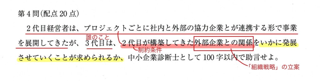 「2代目が構築してきた外部企業との関係」は親切に冒頭からヒントをくれています。=「2代目経営者は、~事業を展開してきた」がこの関係にあたります。本問冒頭の一文からわかるようにA社はアライアンスにより事業展開してきた企業ですので、これは「組織戦略」の立案に関する設問であることがわかります。